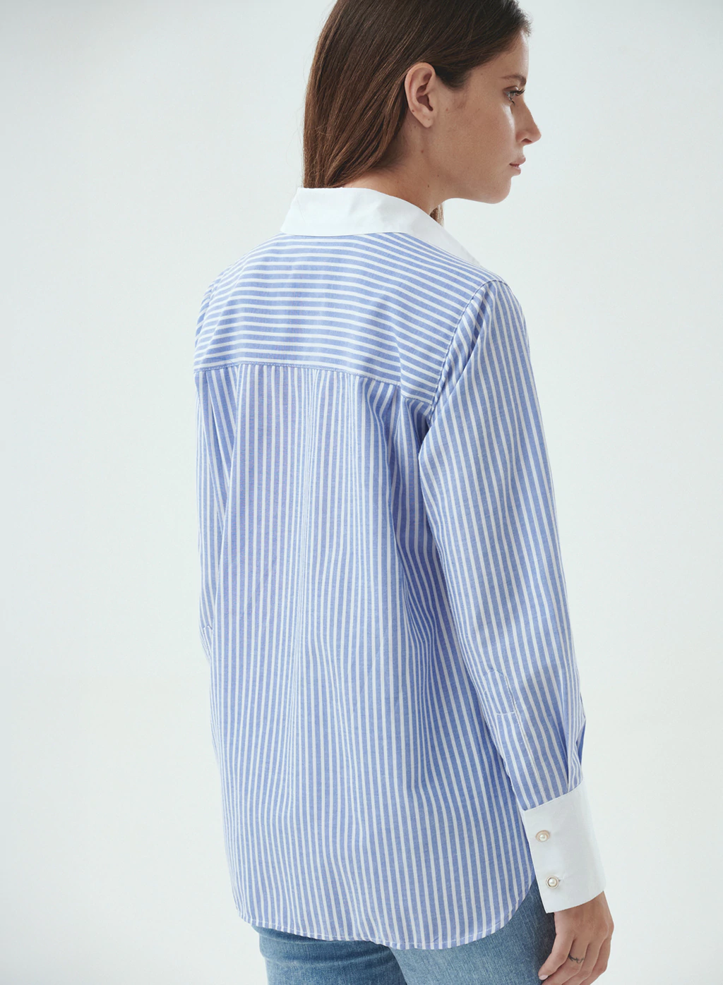 Camisa de silueta recta confeccionada en poplin rayado 100% algodón, con cuello, puños y detalle lateral combinado en poplin liso blanco 100% algodón. Tiene cuello camisa y mangas largas con puños anchos que abrochan con botón de perla. El acceso a la prenda es mediante la cartera frontal a la vista con los mismos botones de perla. En el frente del lado izquierdo tiene un bolsillo plaque a la altura del busto. En la espalda tiene canesú con las rayas con orientación horizontal. El largo es a la cadera con ruedo redondeado con una leve diferencia en el largo. Una prenda delicada y femenina para usar tanto con el jean Paula como con el traje Boyle.