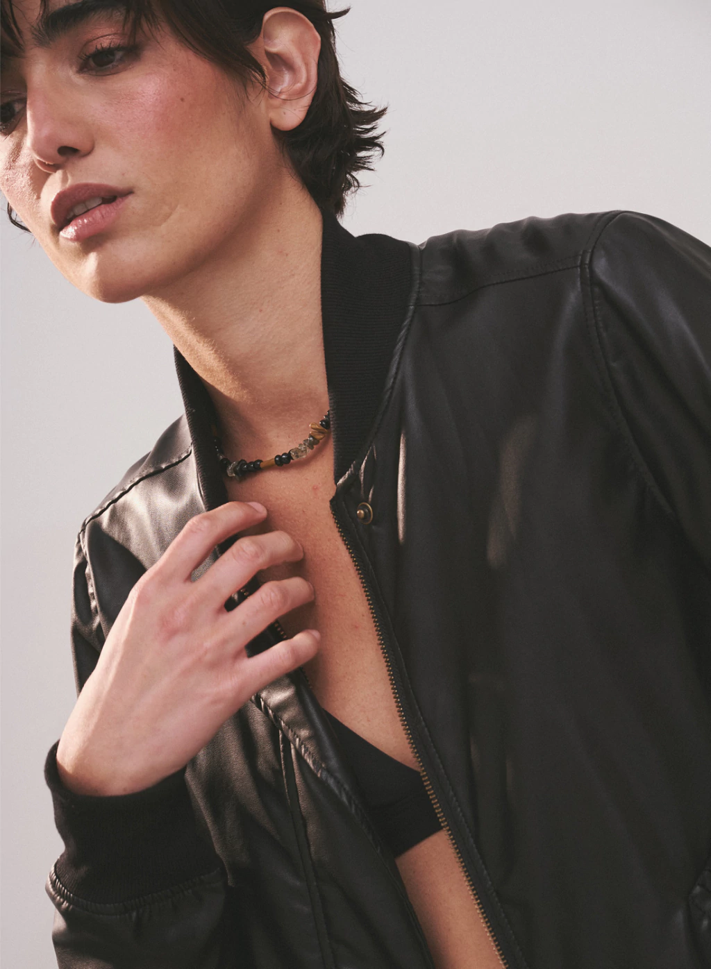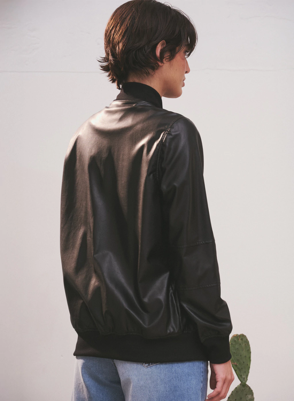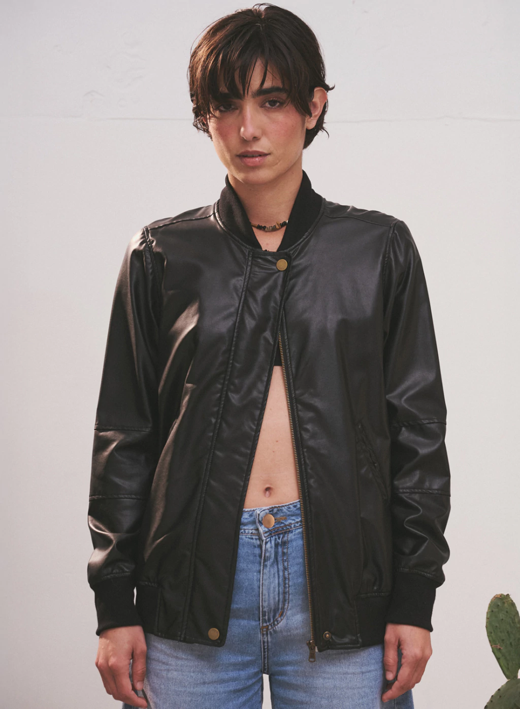 Campera con corte bomber y calce oversize. Está confeccionada en vegan leather, un material que imita el cuero sin usar materiales de origen animal. Tiene cuello, cintura y puños de jersey al tono en punto morley. Las mangas son largas y tienen un recorte a la altura de los codos. El acceso a la prenda es mediante un cierre metálico que está oculto debajo de la solapa delantera de la campera. Tiene bolsillos laterales y largo a mitad de cadera. El interior está forrado en fibrana estampada. Es el complemento ideal para todos tus looks: combinala con la bermudas Kate de jean para el día o con el pantalón sastrero Mojito para una salida a cenar.