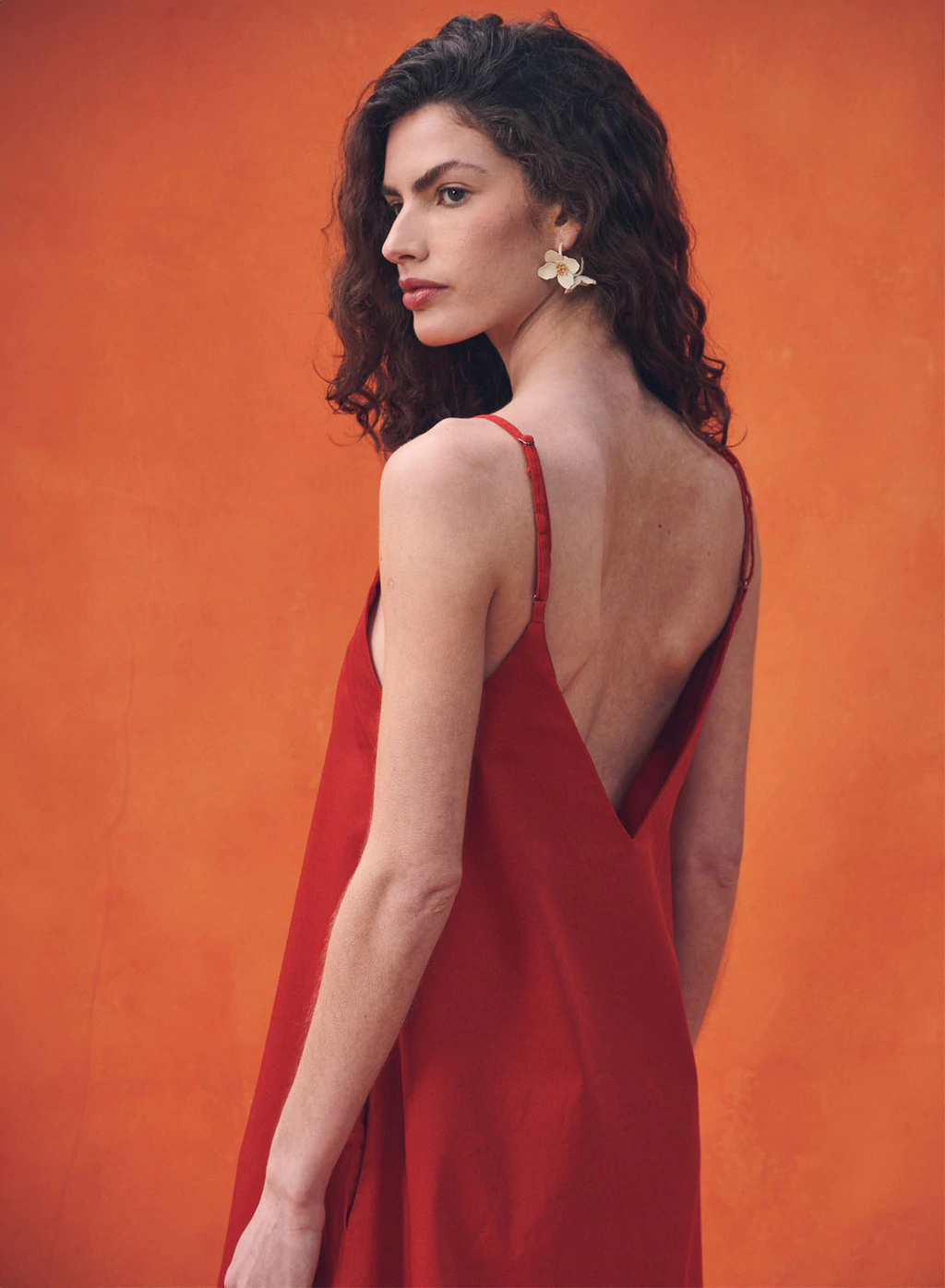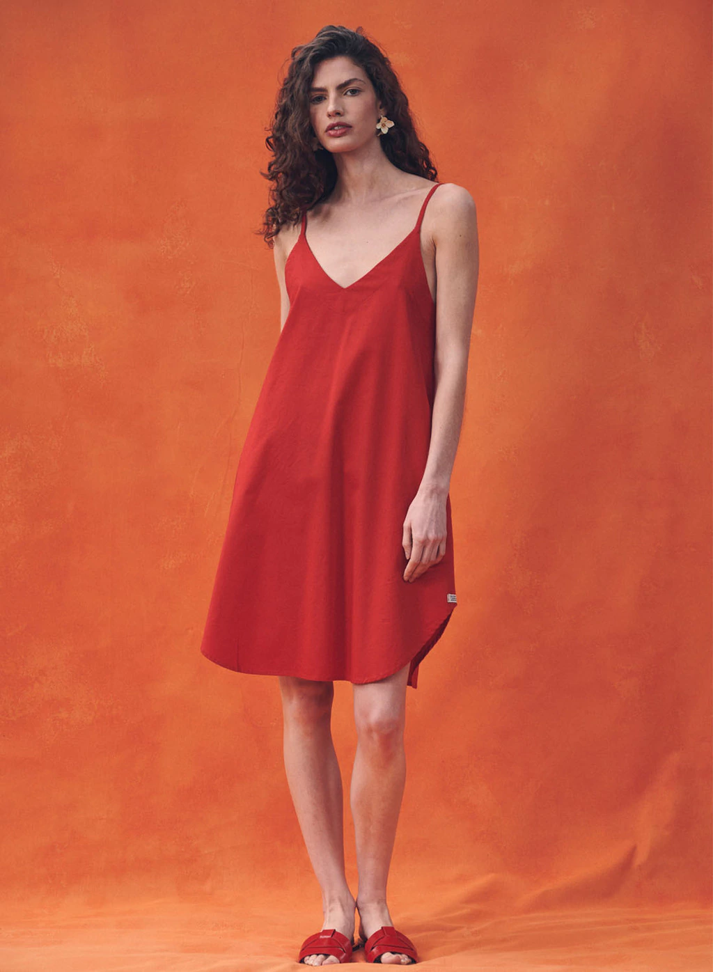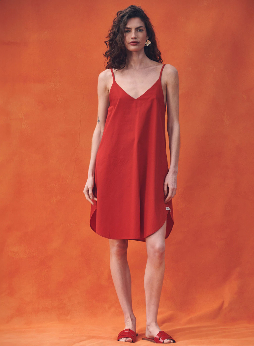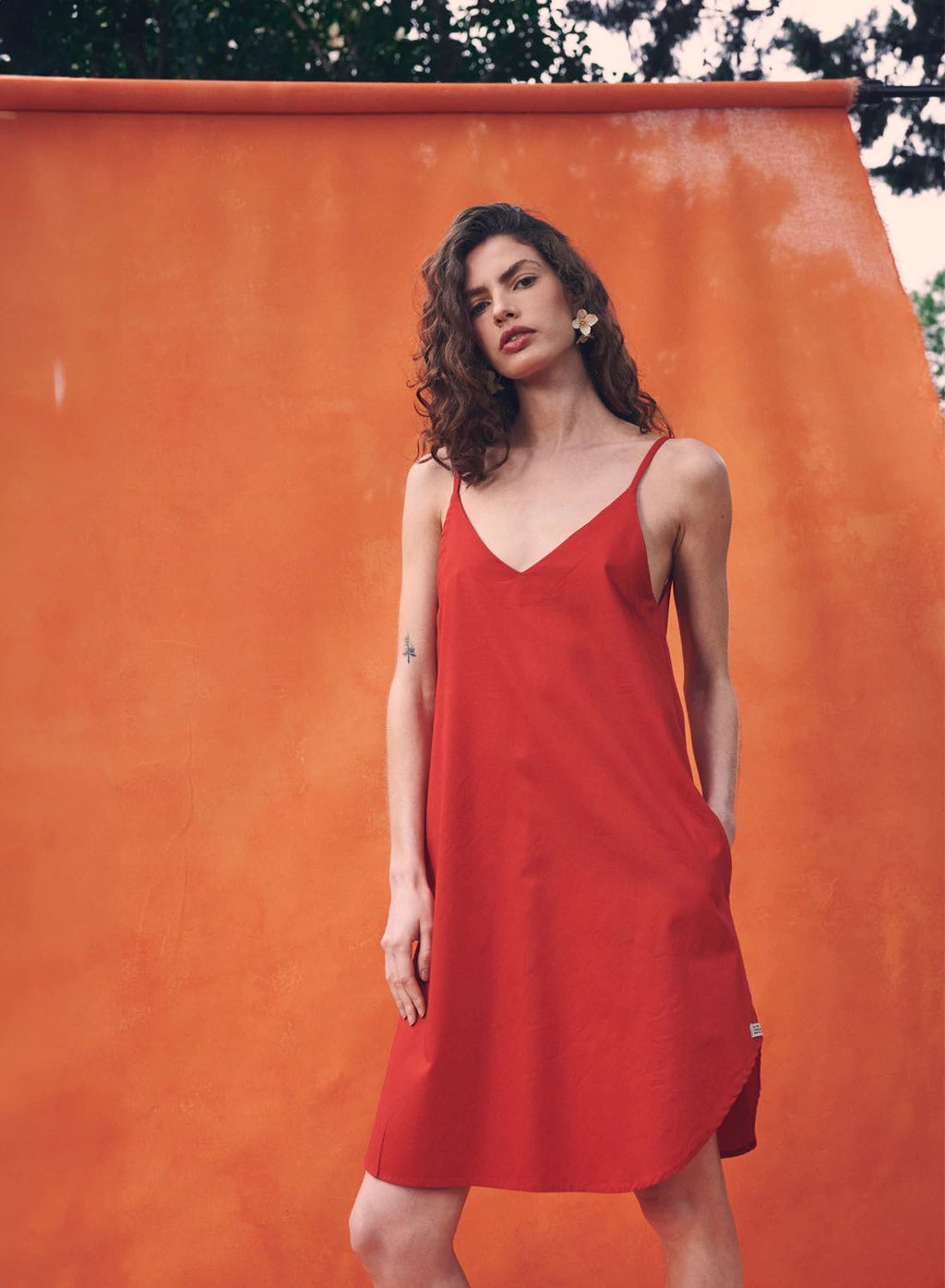 Vestido de estilo solero con corte holgado. Está confeccionado en gabardina liviana de 5 onzas y tiene escote en V en frente y espalda. Tiene bolsillos laterales internos forrados al tono, que le dan el toque canchero, práctico y cómodo para el día. Los breteles son finitos con regulador para adaptar la altura del escote y el largo de la prenda a los distintos cuerpos. El largo es por arriba de la rodilla y el ruedo es redondeado con tajos laterales. Una prenda práctica y femenina para el verano. Usala con sandalias y sumá el camisaco Tijuana para el atardecer.