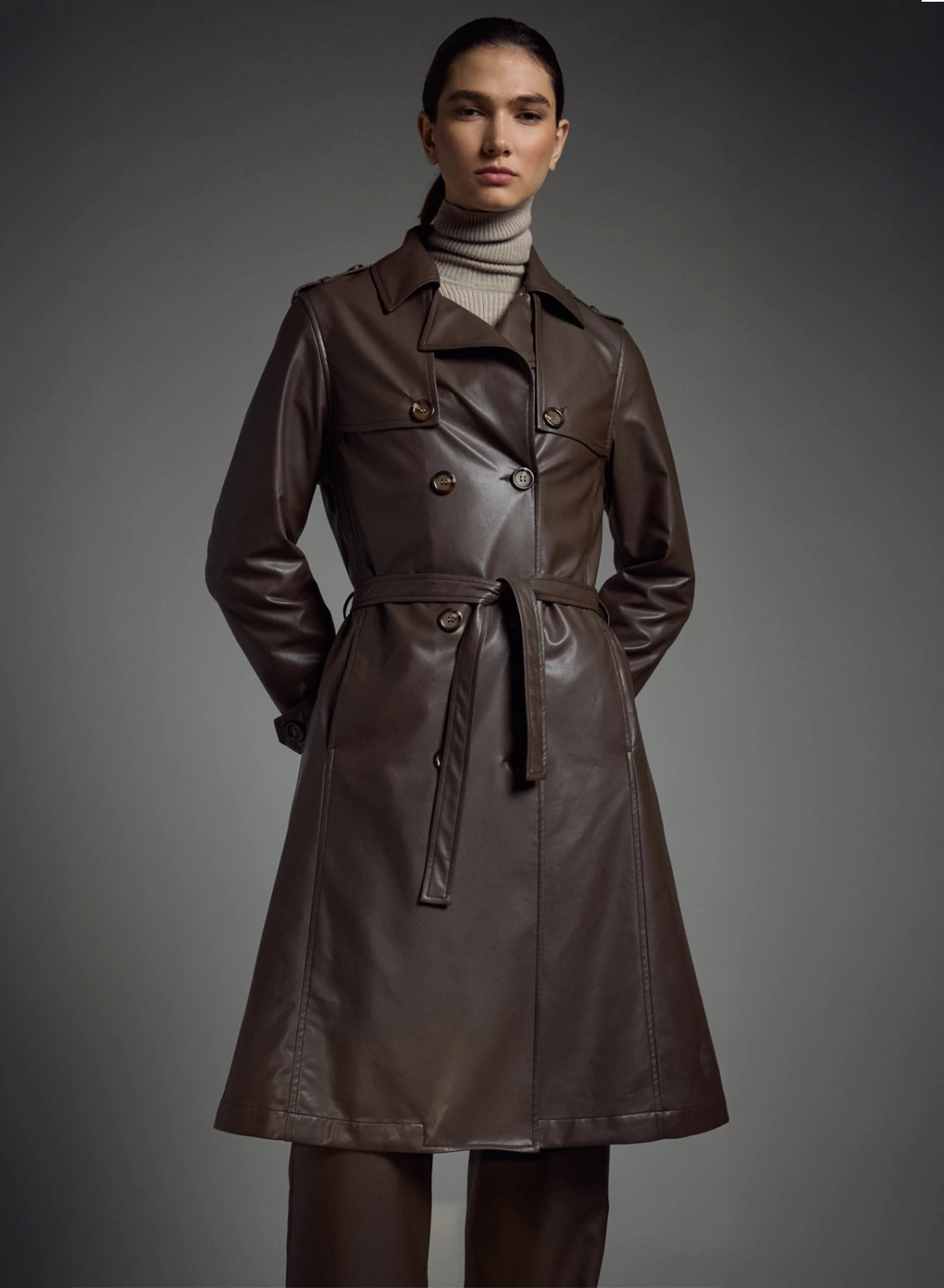 Trench de corte holgado confeccionado en vegan leather y forrado en tafeta al tono. Tiene cuello solapa, el cruce es delantero y abrocha con seis botones externos marmolados. Tiene bolsillos laterales internos y canesú en la espalda con un botón. Las mangas son largas, tienen traba en los puños que ajusta con un botón y en los hombros tiene charreteras. La cintura se ciñe con un lazo de la misma tela o se puede usar suelto. El largo es por debajo de la rodilla. La prenda que nos enamoró a primera vista para usar sola como un vestido protagonista o con la polera Castlefield y el pantalón Manchester.